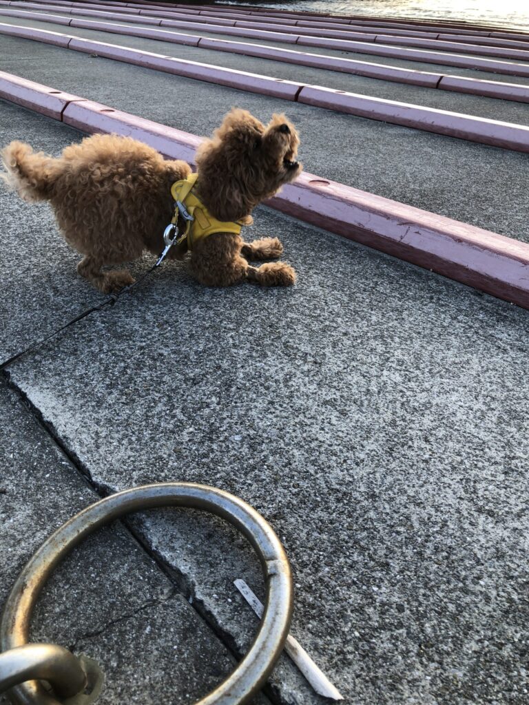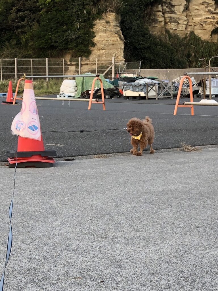 工事現場の赤いポールにリードが引っ掛かり困惑するたまこさ~や