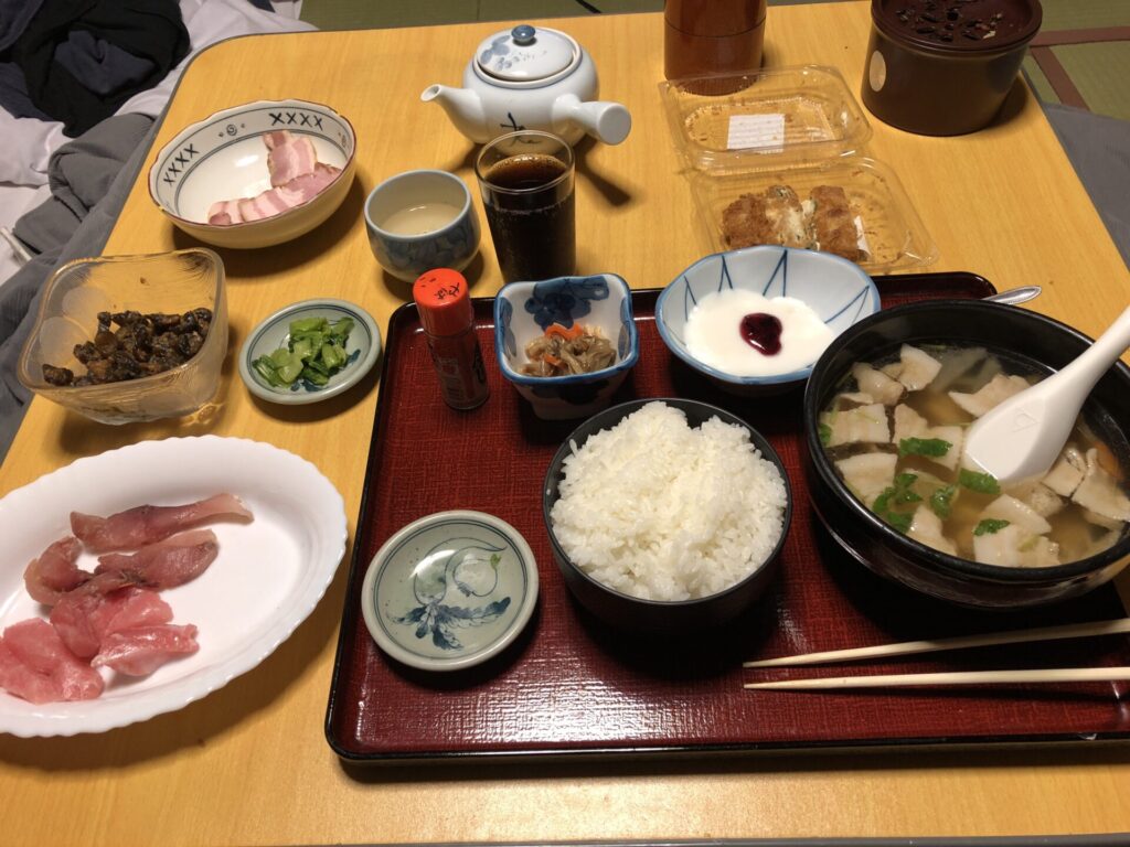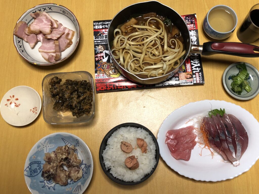 初日の夕飯は名古屋人らしく味噌煮込みうどんを作り、大トロ、いさぎの刺身にベーコンやイカをマヨネーズで和えたものを持ち込む
