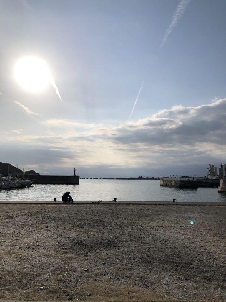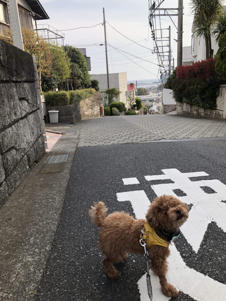 こちらは秘かなビュースポット 坂の上から海を見下ろす